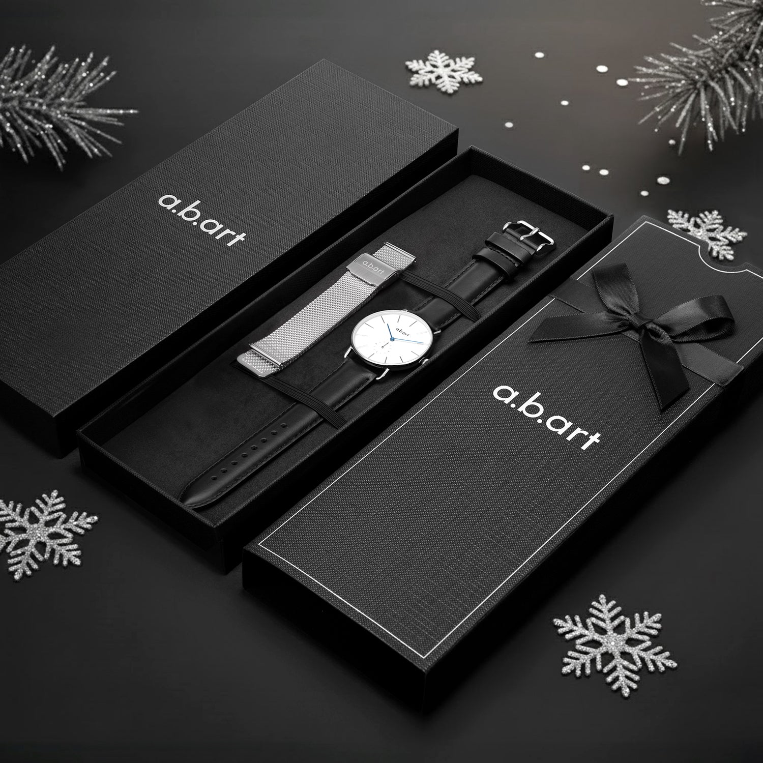 Discover elegance with a.b.art 36mm watch featuring a sleek white dual-dial and classic black leather strap. Powered by Ronda Swiss parts movement and protected by sapphire crystal, it combines sophistication and precision. Perfect for any occasion, it’s a timeless accessory for the modern woman.