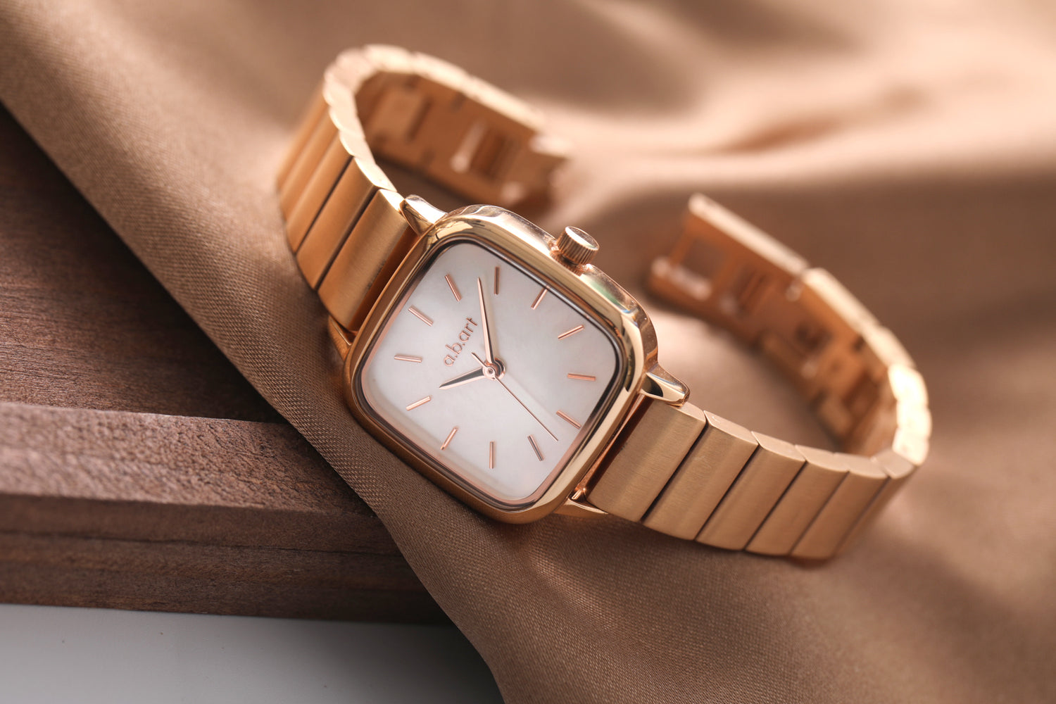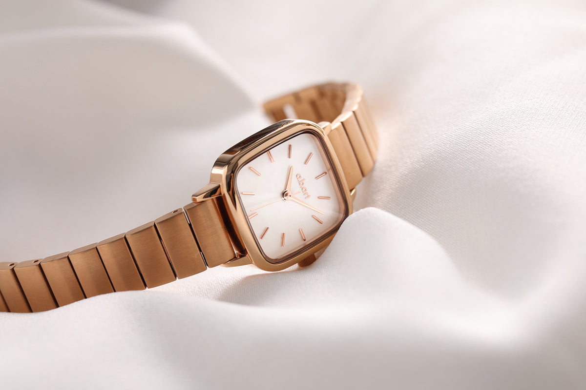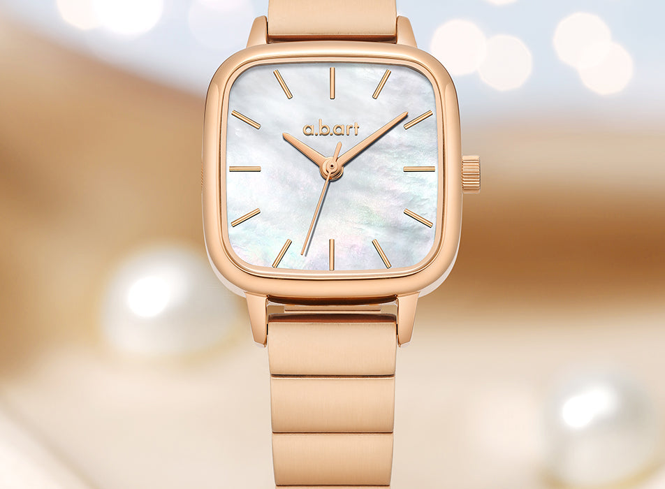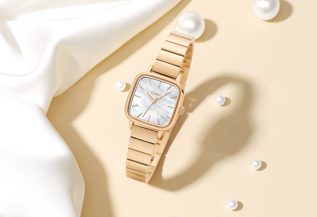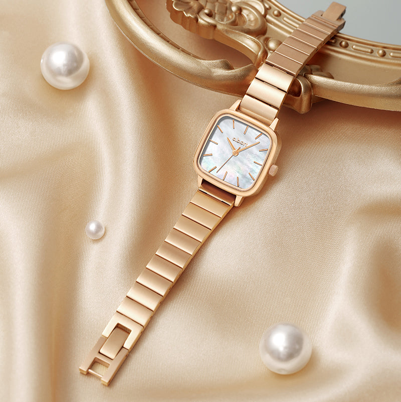 The watch is crafted in luxurious rose gold, featuring a 24x24mm smooth and rounded dial made from unique natural mother-of-pearl. It is complemented by a 12mm wide bamboo link bracelet, with the gold casing and white mother-of-pearl dial enhancing each other beautifully. Inspired by modern aesthetics and the beauty of nature, the design blends elegance with innovation. Its distinctive rounded square case breaks traditional design boundaries, offering a look that is both modern and classic, adding a touch of brilliance to the wearer's overall style. This watch aims to create a timepiece that expresses individuality while maintaining practical beauty.