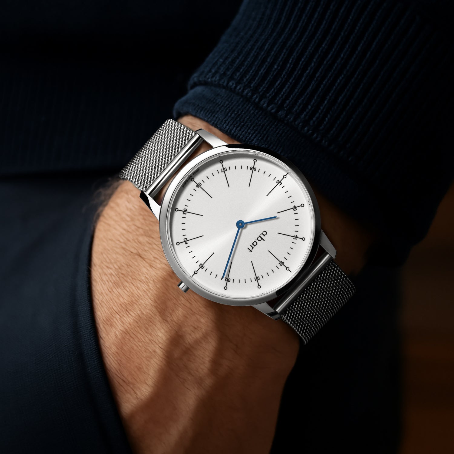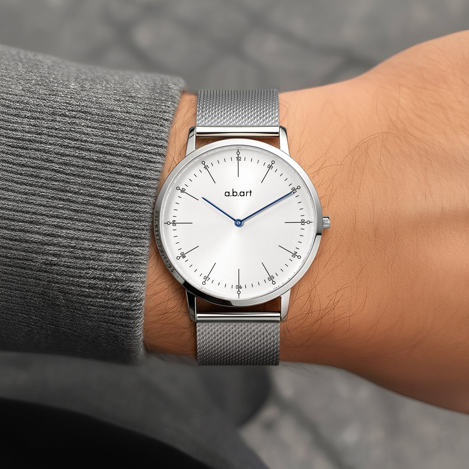 The FL41 is a perfect embodiment of Bauhaus-style aesthetics, blending precision craftsmanship with timeless elegance. With a 41 mm diameter and an ultra-slim 5.9 mm profile, this watch exudes a refined yet understated charm on the wrist. Its 316L stainless steel case frames a pristine white dial, featuring clean, minimalist markers and vibrant blue hands that add a striking touch of sophistication. The stainless steel Milanese mesh strap complements the design, offering comfort and modern versatility.