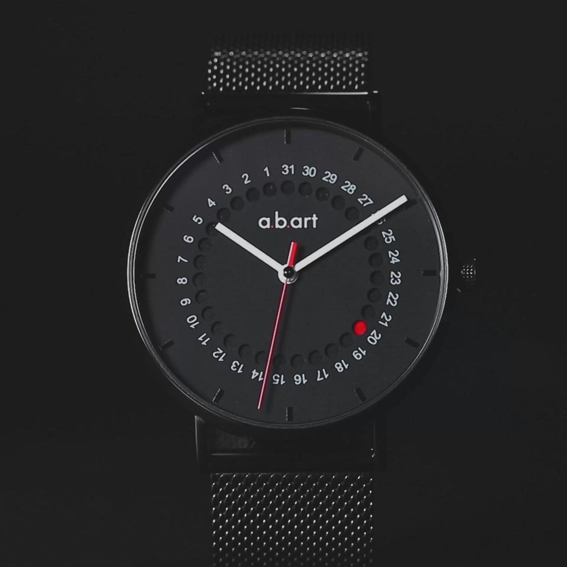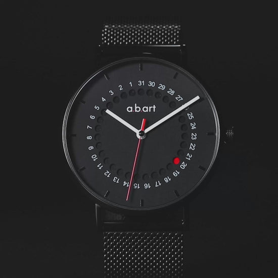 The a.b.art Red Dot Design Award Series All-Black Watch, where precision meets style. This watch features a personalized dial with a unique date display, encased in a sleek 41mm case. Paired with a sophisticated stainless steel mesh strap, it’s designed for both elegance and performance. The sapphire crystal face ensures clarity and durability, while the Ronda Swiss parts movement guarantees reliable precision. Perfect for those who embrace a bold, sport-inspired aesthetic.