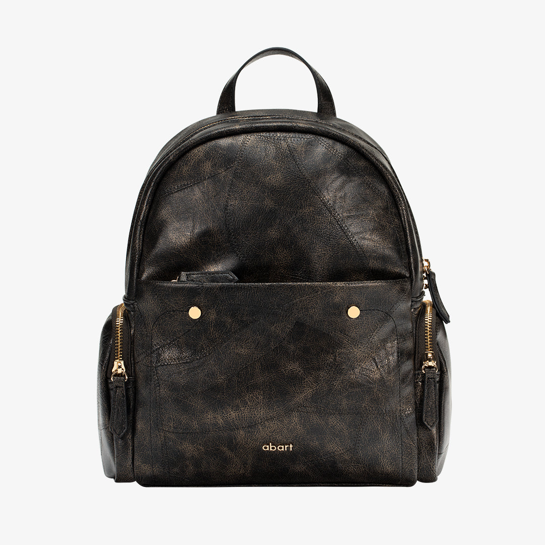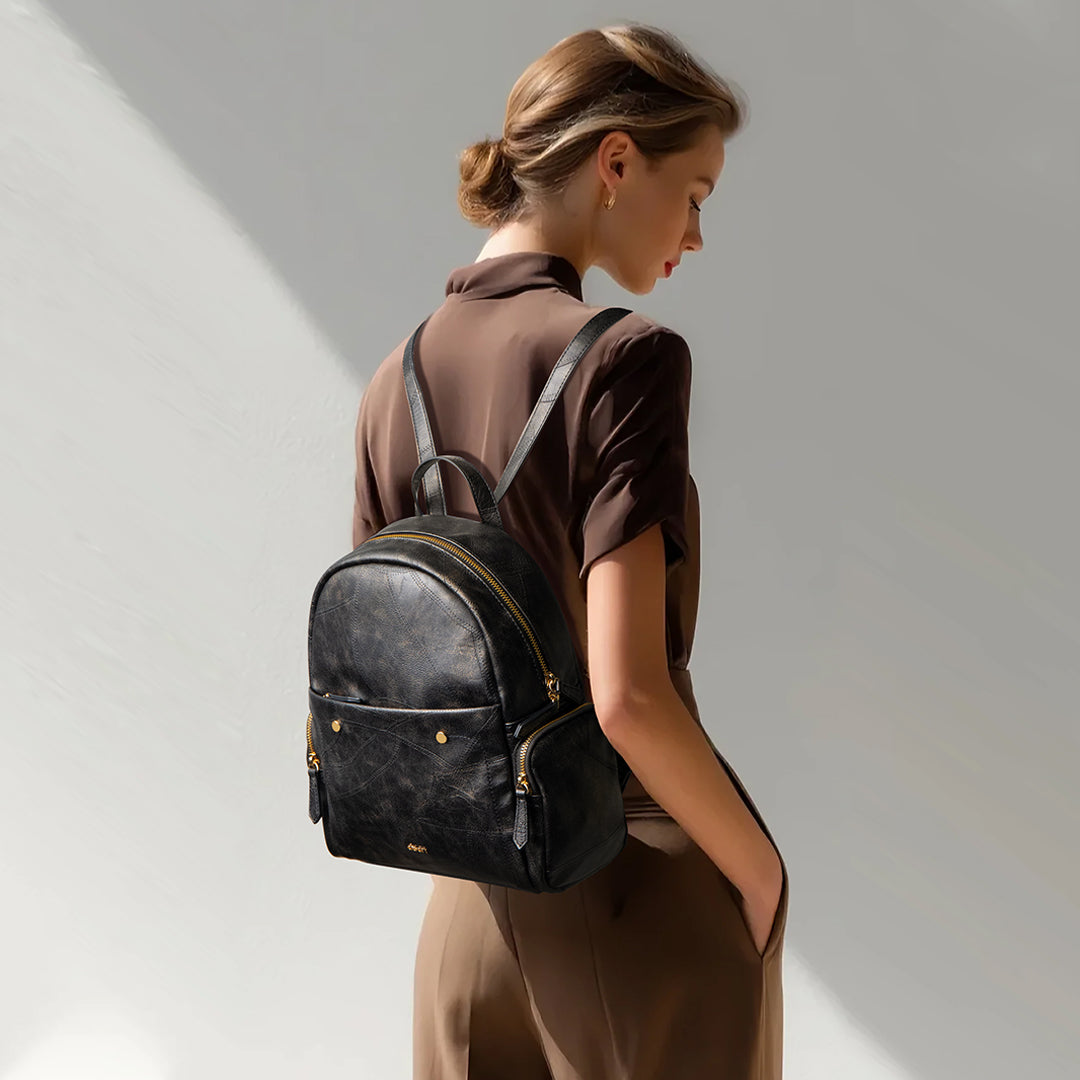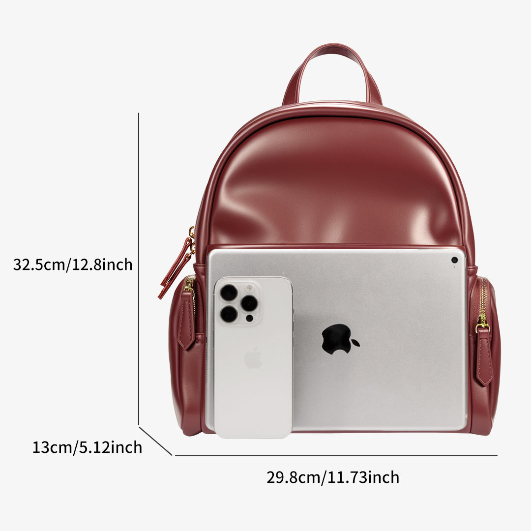 Crafted from refined waxed PU leather, this backpack boasts a silky-smooth, luxurious texture. The two gold-tone studs on the front pocket add a bold, eye-catching detail. Designed with adjustable shoulder straps, it easily transforms between a handbag, shoulder bag, or backpack to suit your style.