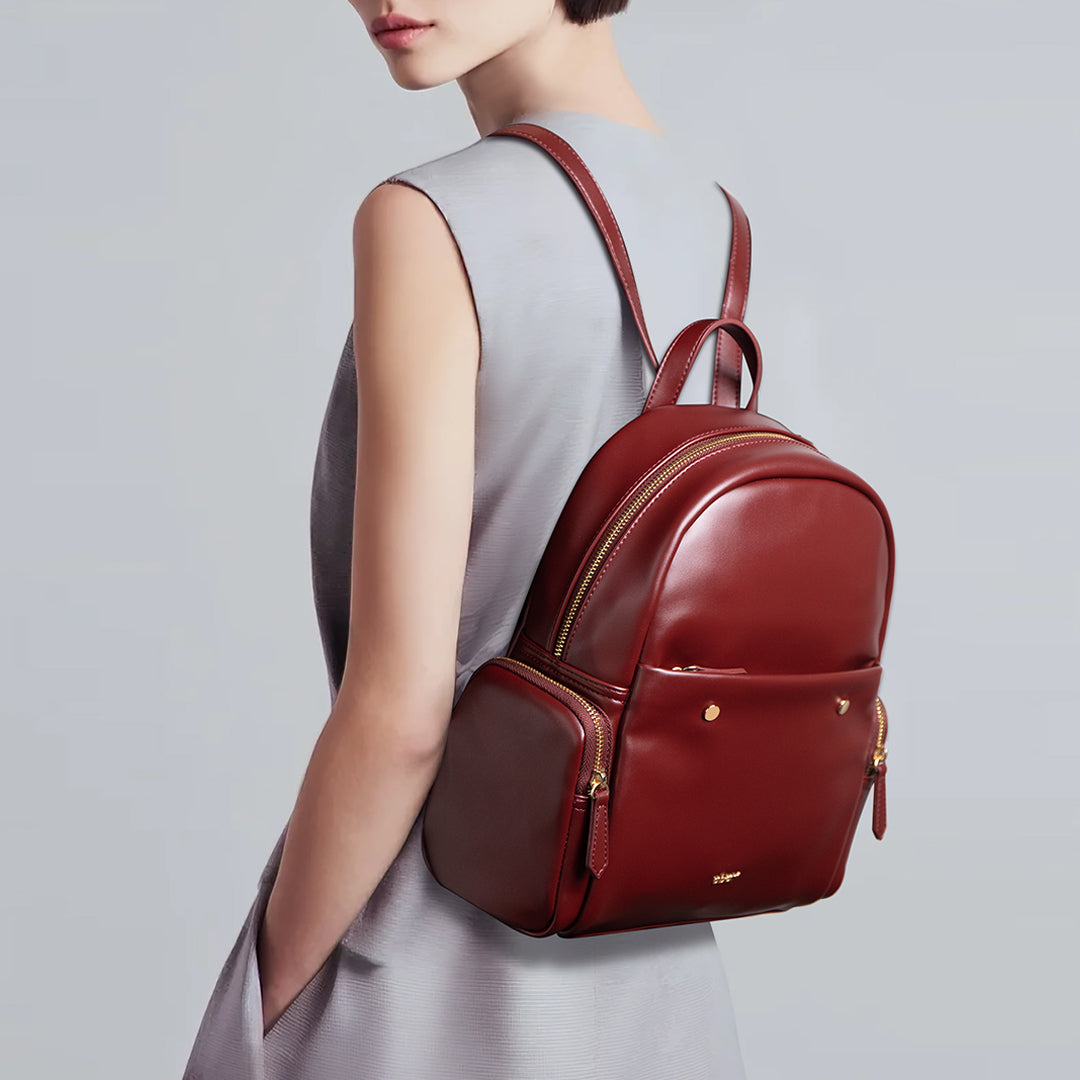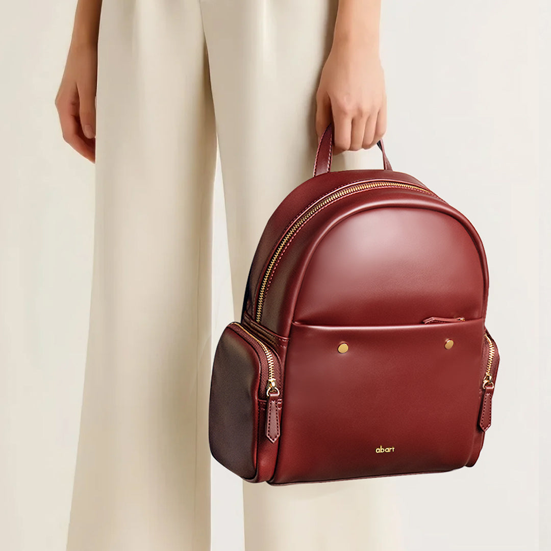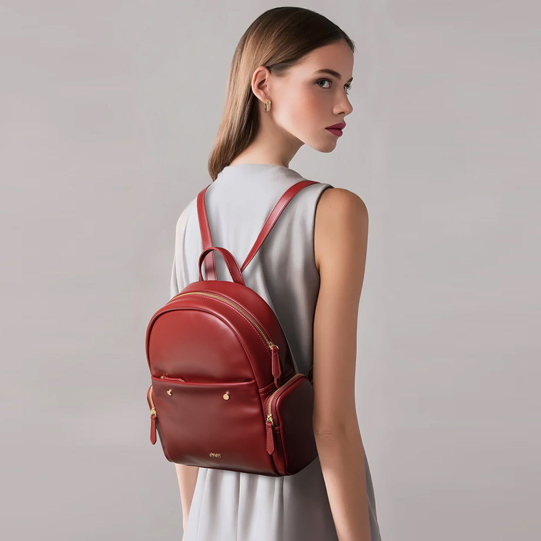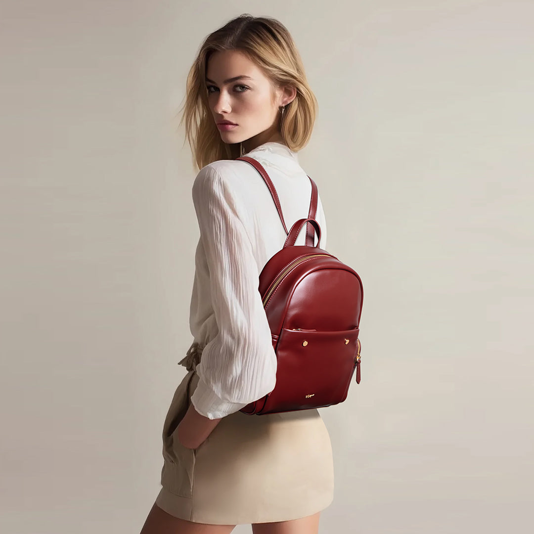In a standout shade of deep wine red, this leather backpack is a statement-maker with smarts. Switch it from shoulder to hand to back—your style, your rules. With roomy compartments, sleek zippers, and a polished metal buckle, it’s ready for anything, just like you.