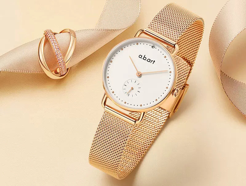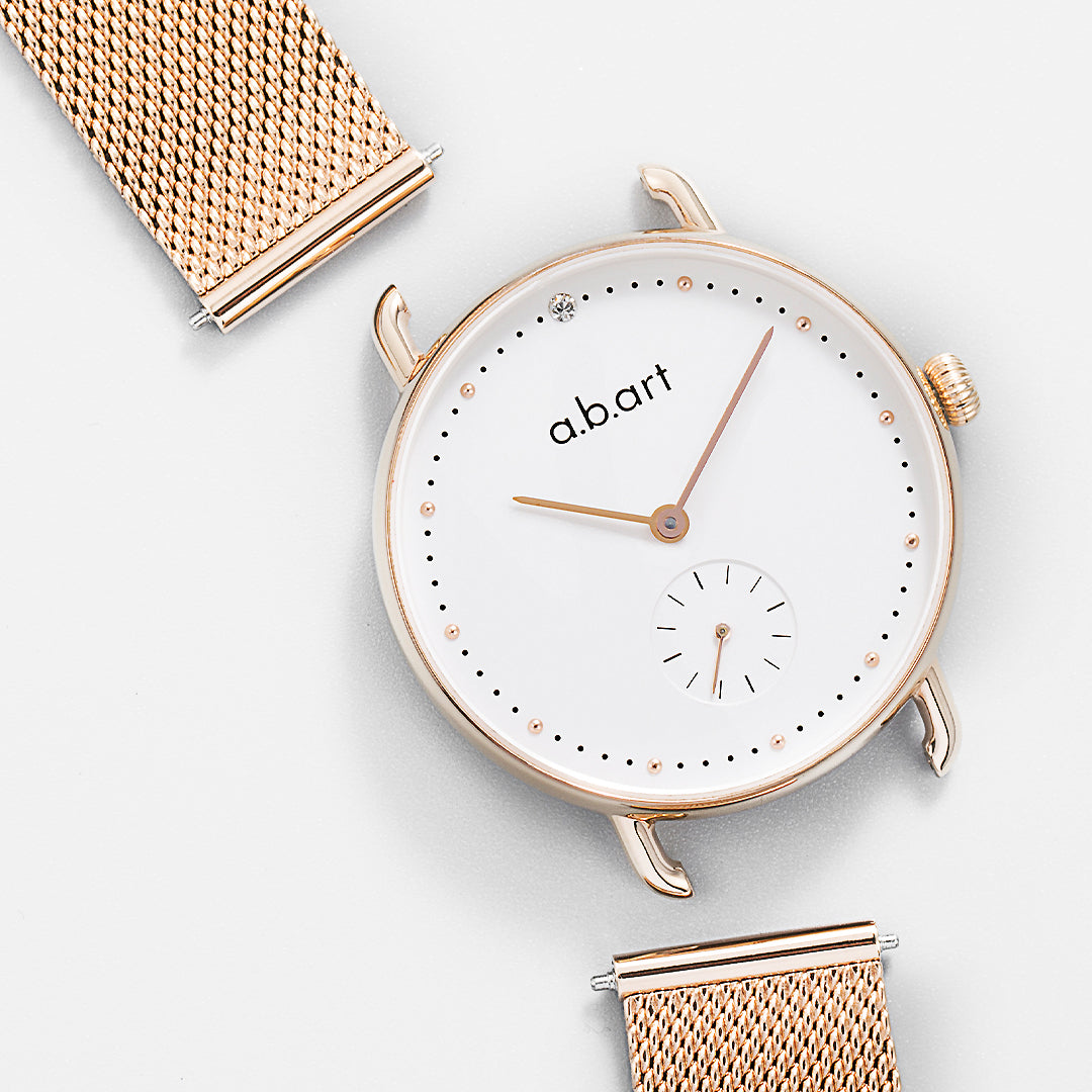 Experience refined sophistication with a.b.art’s 36mm rose gold watch. The minimalist white dual-dial design paired with a sleek mesh strap exudes modern elegance. Ronda Swiss parts movement guarantees precision, while the sapphire crystal offers unparalleled clarity and scratch resistance. This watch is the perfect blend of luxury and functionality, crafted for the discerning woman who values both style and performance.